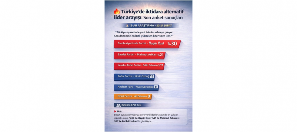 Saadet Partisi Mersin İl Başkanı Bilal Oğuz, İZ-AR Araştırma tarafından 20–27 Şubat tarihleri arasında gerçekleştirilen kamuoyu araştırmasının Türkiye siyasetinde yeni lider arayışını ortaya koyduğunu ifade etti. Araştırmada vatandaşlara “Türkiye siyasetinde yeni liderler sahneye çıkıyor. Son dönemde en hızlı yükselen lider sizce kim?” sorusunun yöneltildiğini hatırlatan Oğuz, sonuçların dikkat çekici olduğunu dile getirdi.