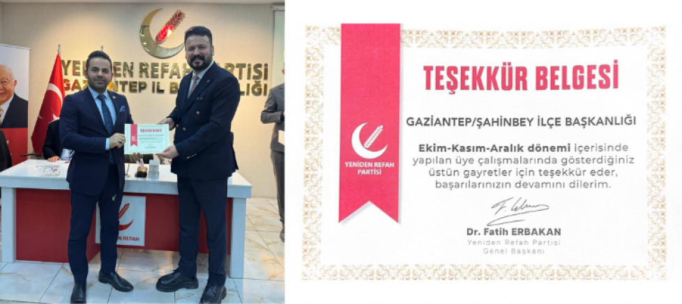 Yeniden Refah Partisi Şahinbey İlçe Başkanı Emre Öztürk, Genel Başkan Dr. Fatih Erbakan tarafından Şahinbey Teşkilatı’na gönderilen teşekkür belgesinin İlçe Başkanlığı’na takdim edilmesi dolayısıyla bir açıklama yaptı.